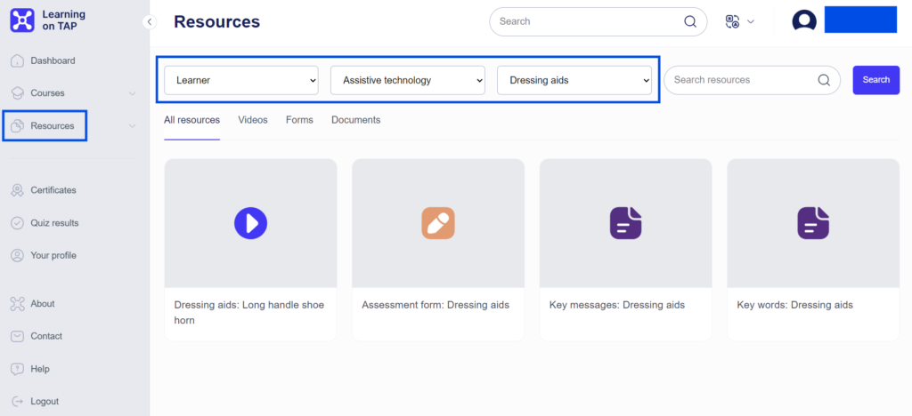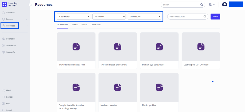 Module resources can also be accessed on the Resources page using the filters and search function.