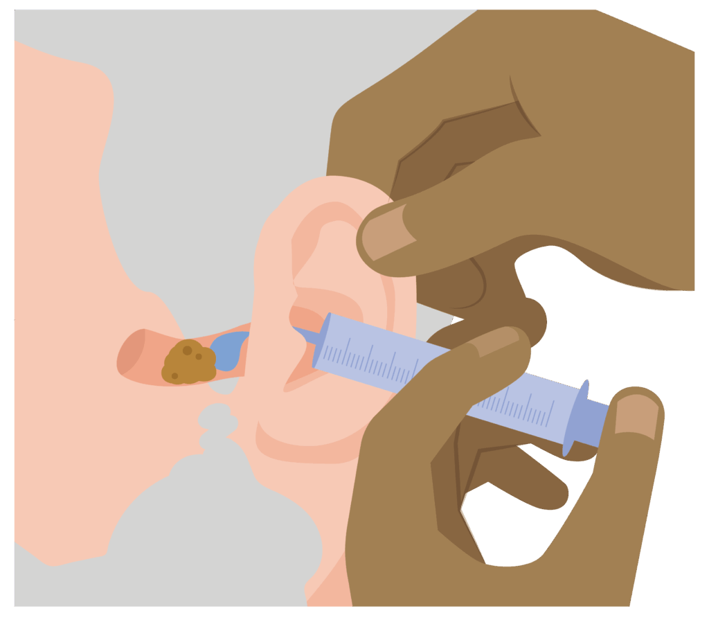 The tip of the syringe is placed fully inside the person’s ear canal.