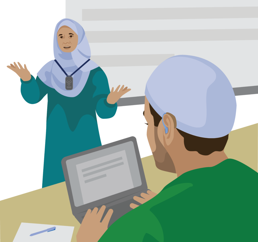 During lectures his professor wears a microphone transmitter. This connects to a receiver on Mahmoud’s hearing aid.